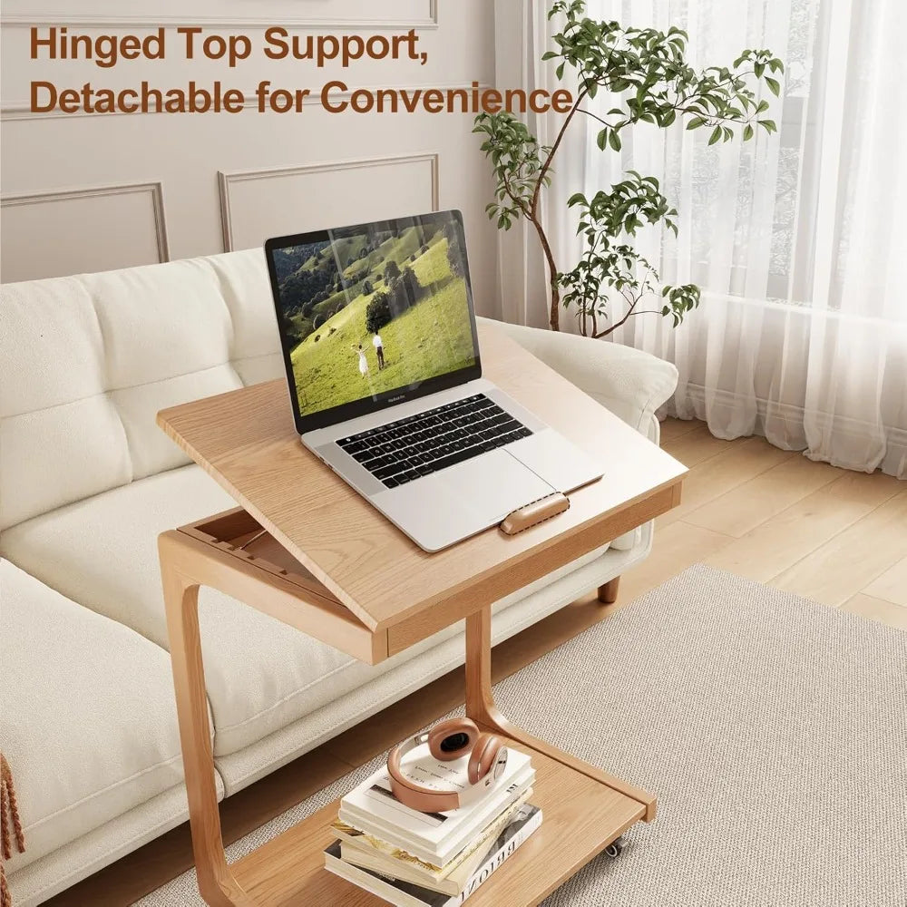 Compact Rolling C-Shaped Side Table Lockable Wheels